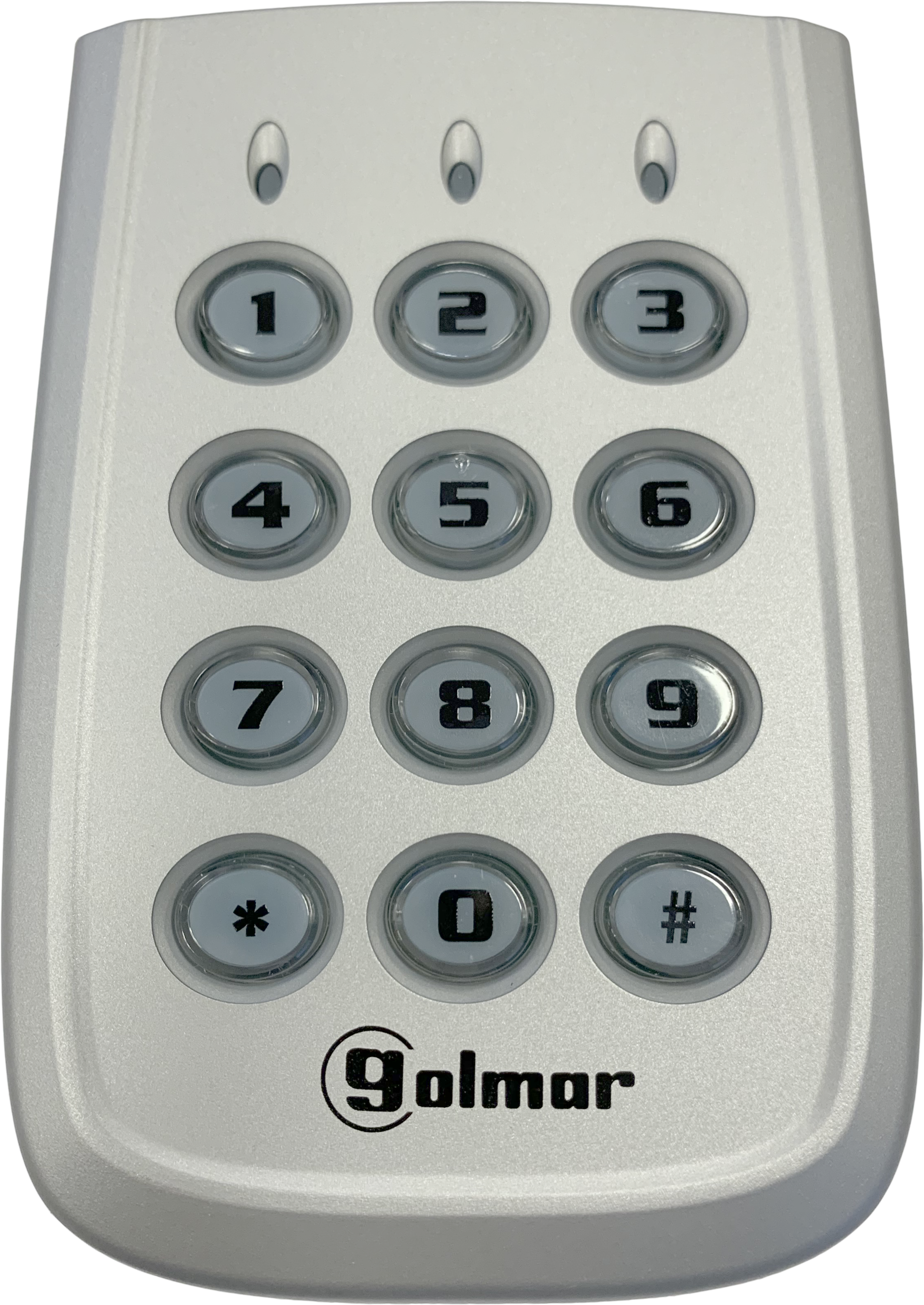 Opbouw. IP65. Slagvaste ZAMAK behuizing gemoffeld in aluminium kleur. Blauw verlichte toetsen. Twee relais' NO/NC. 100 gebruikerscodes naar keuze van 3 tot 8 digits, één code kan gebruikt worden voor meerdere relais uitsturingen. 3 indicatie leds, akoestische feedback bij bediening van de toetsen. Tamperfunctie. Voeding (afhankelijk van de aangesloten deuropener) 12/24 Vdc/Vac. Werkingstemperatuur: -20 °C tot +60 °C