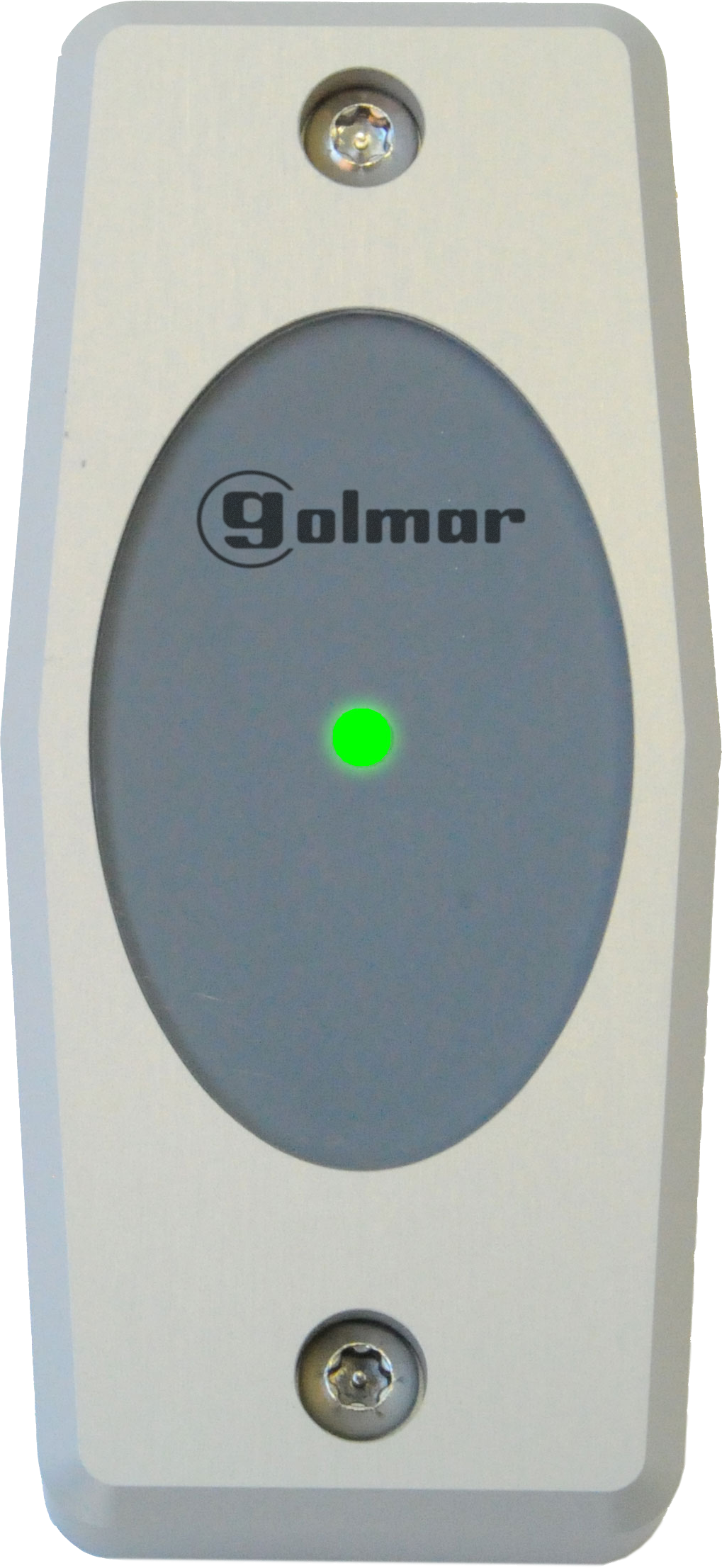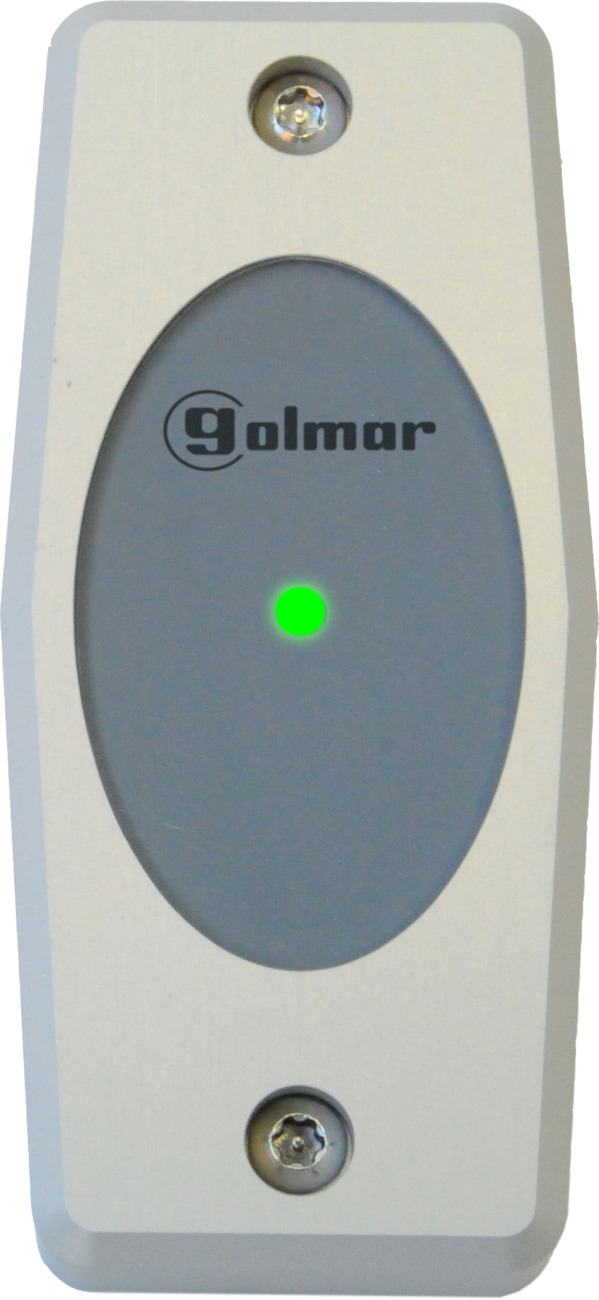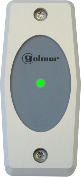 Opbouw, polycarbonaat. 13.56 Mhz. Leesafstand max. 60 mm. Indicatie led: groen bij akkoord en knipperend rood bij weigering. 2 aders FTP of STP, max. 30 meter of 0,8 mm afgeschermd tot max. 100 meter.