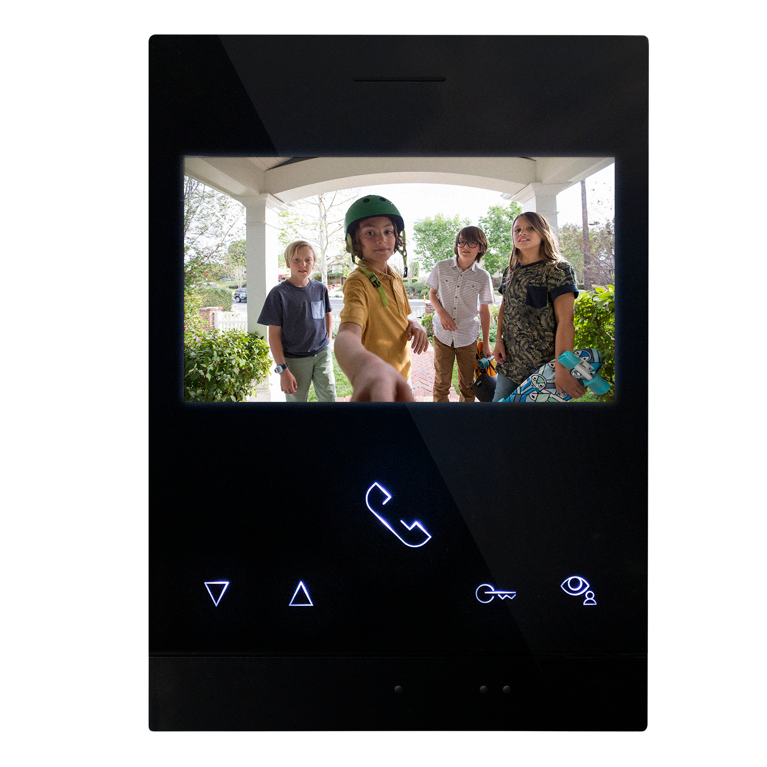 Wandmodel, opbouw, inclusief montageframe, zwarte uitvoering. 4.3" beeldscherm met soft-touch bedieningstoetsen, backlighted bij bediening. Status leds. Spy, zelf-oproep, doktersfunctie* (*deur ontgrendeld bij aanbellen).