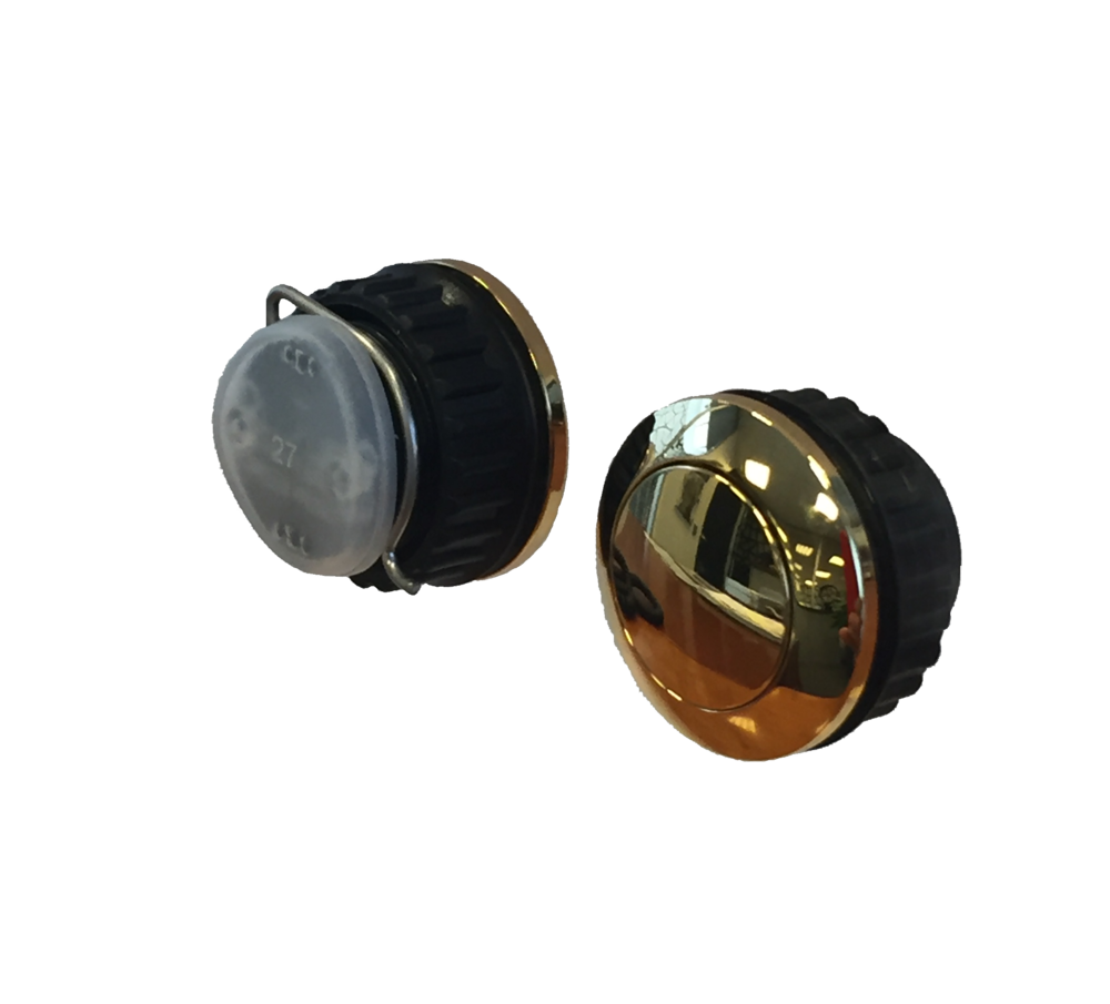 Messing vergulde behuizing én bolle dome bouton | Max. 24V AC/DC - 1,5Amp | Vergulde insteek contacten bedrading (0,6mm - 0,8mm) inclusief speciale tool voor losmaken | Kunststof montagering | Rubber seal voor extra afdichting insteekcontacten | IP 54; stof en spatwaterdicht | Voor plaatdikte tussen 0,5 en 6 mm