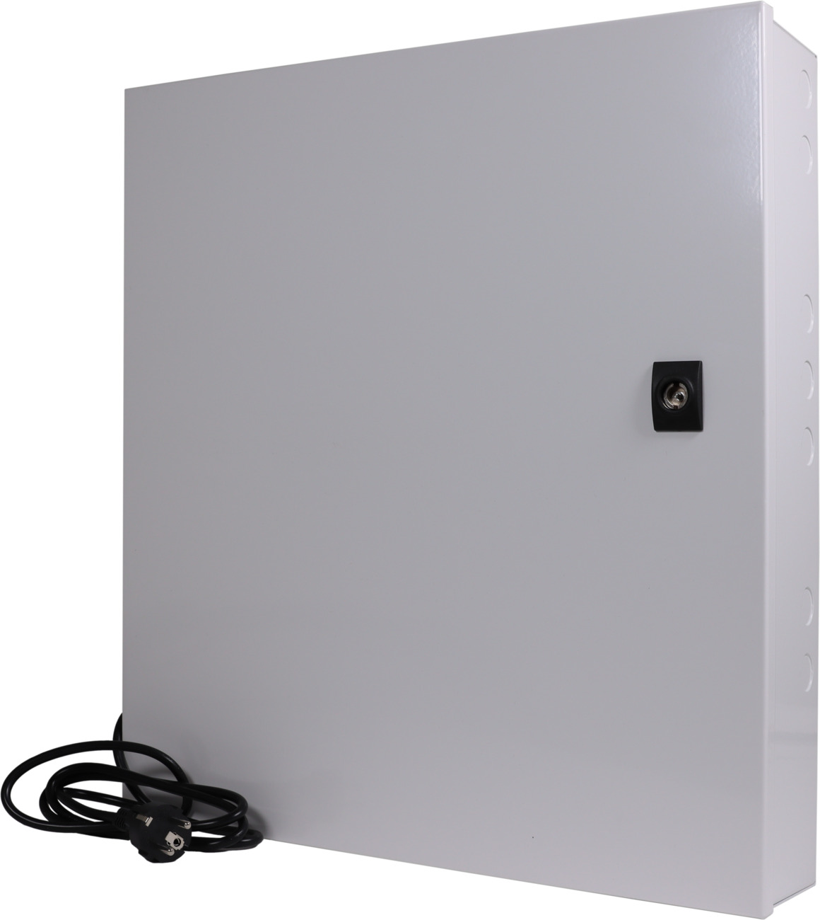 Kast van 1 mm dik staal, gepoedercoat in RAL 9003. Ventilatiesleuven. Scharnierende deur; afsluitbaar.