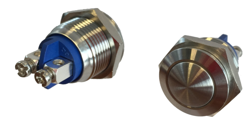 Geborstelde RVS behuizing en bouton | Verchroomde schroefcontacten voor de bedrading | Rubber o-ring en RVS montagering (steek 19mm) | IP65 (spuitwaterdicht) - IK09 | Voor plaatdikte tussen 0,5 en 10 mm, uitermate geschikt voor toepassing in TRESPA