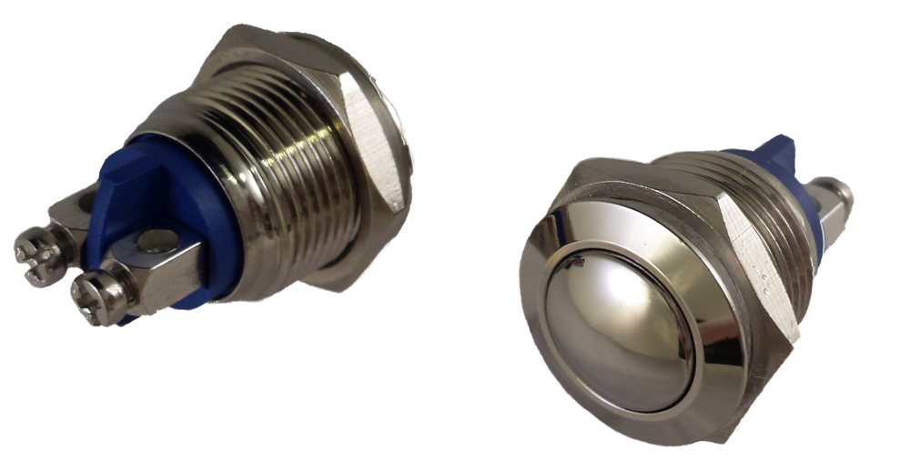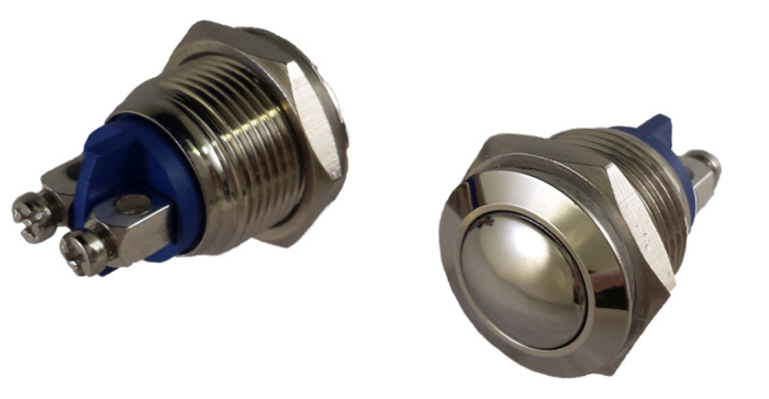 Messing vernikkelde behuizing en bouton | Verchroomde schroefcontacten voor de bedrading | Rubber o-ring en zwaar verchroomde stalen montagering (steek 19mm) | IP65 (spuitwaterdicht) - IK09 | Voor plaatdikte tussen 0,5 en 10 mm, uitermate geschikt voor toepassing in TRESPA panelen